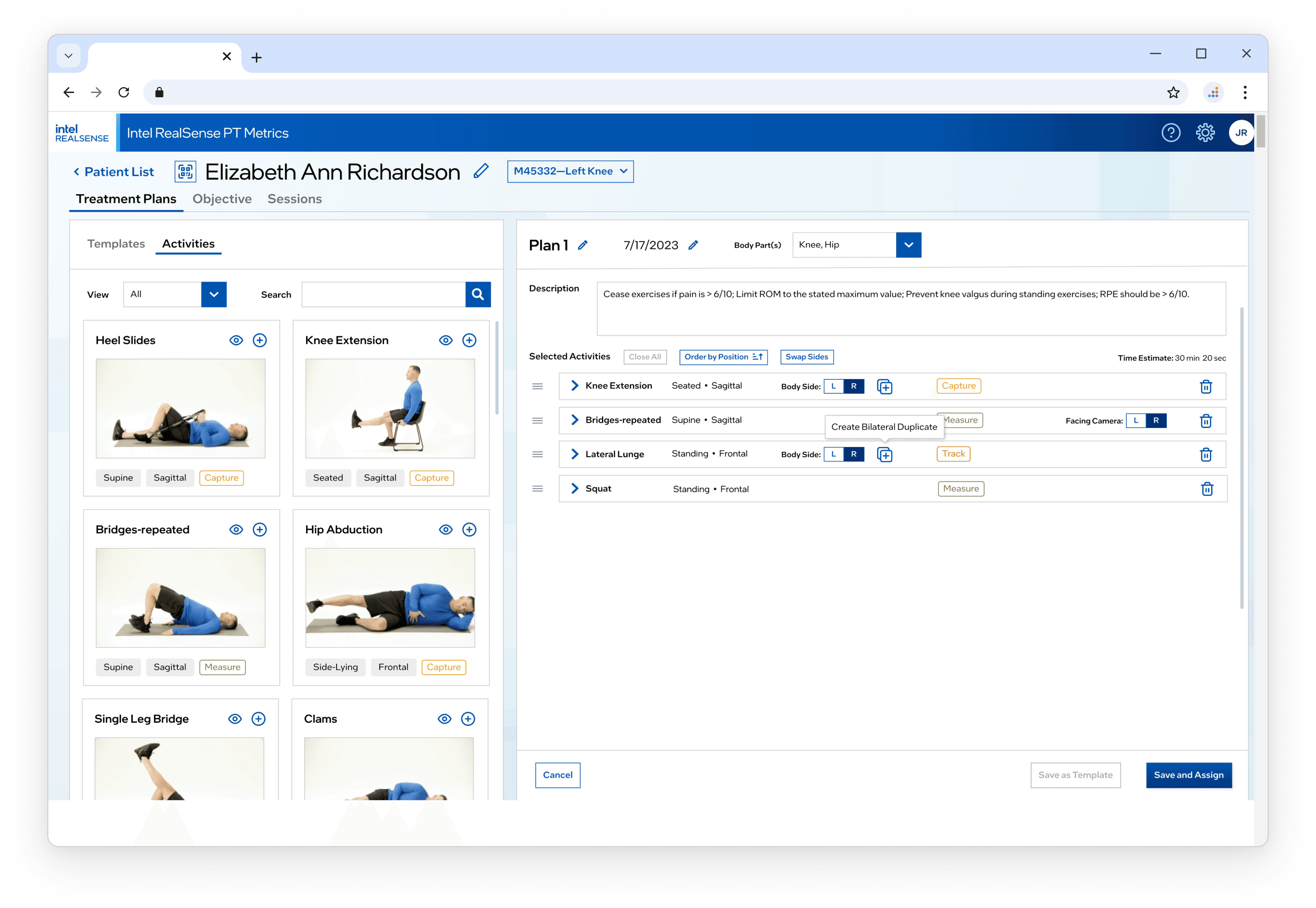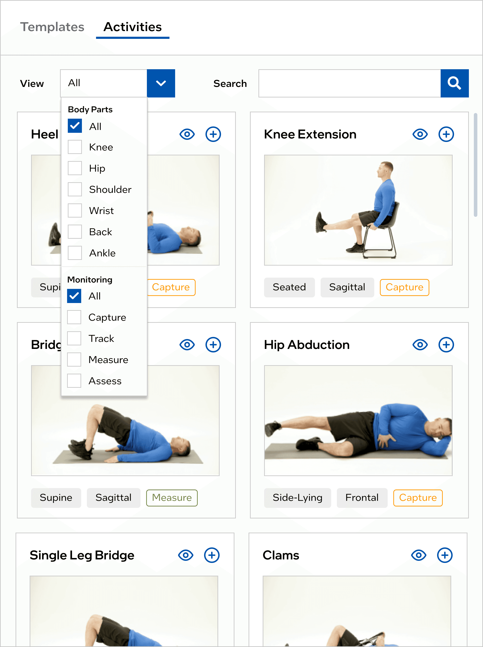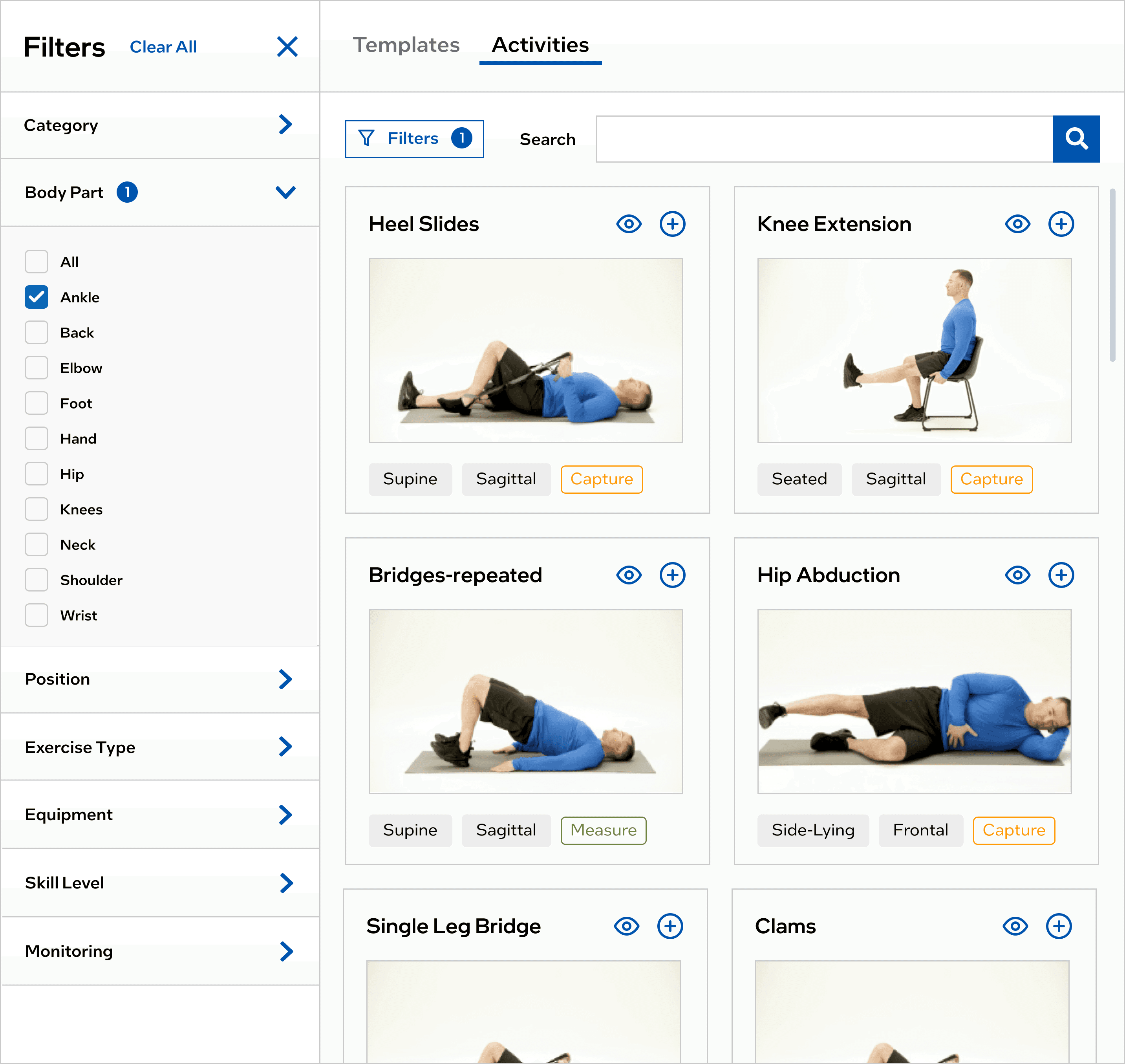 To help clinicians more easily find exercises, we introduced a comprehensive search filter that allows filtering by body part, position, equipment, skill level, and more making it easier to view all relevant options at a glance.