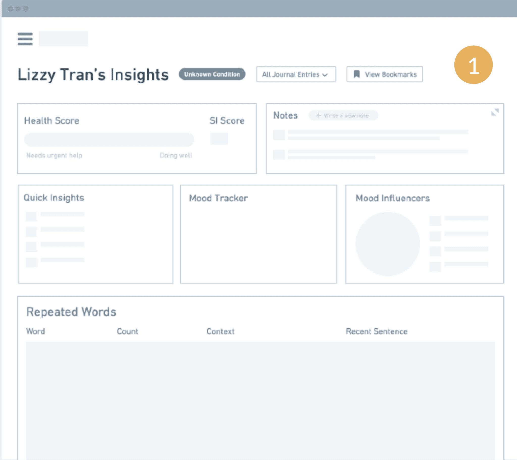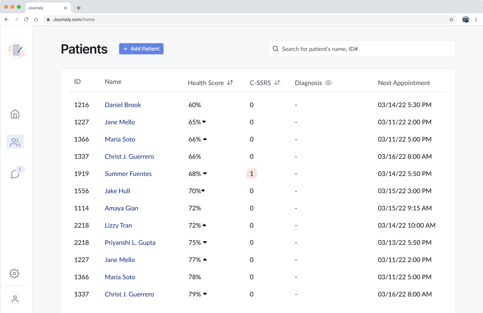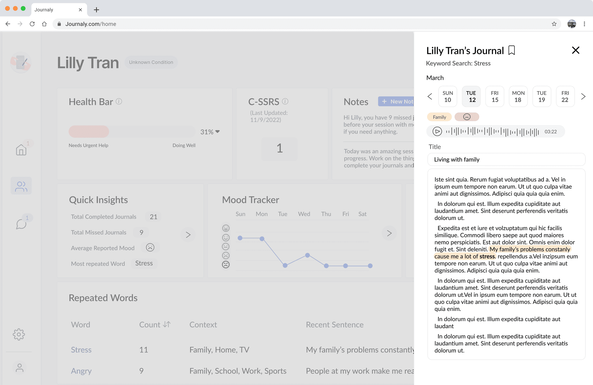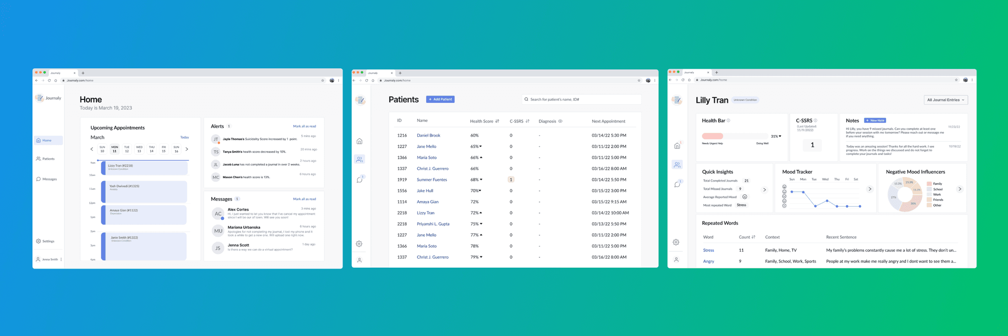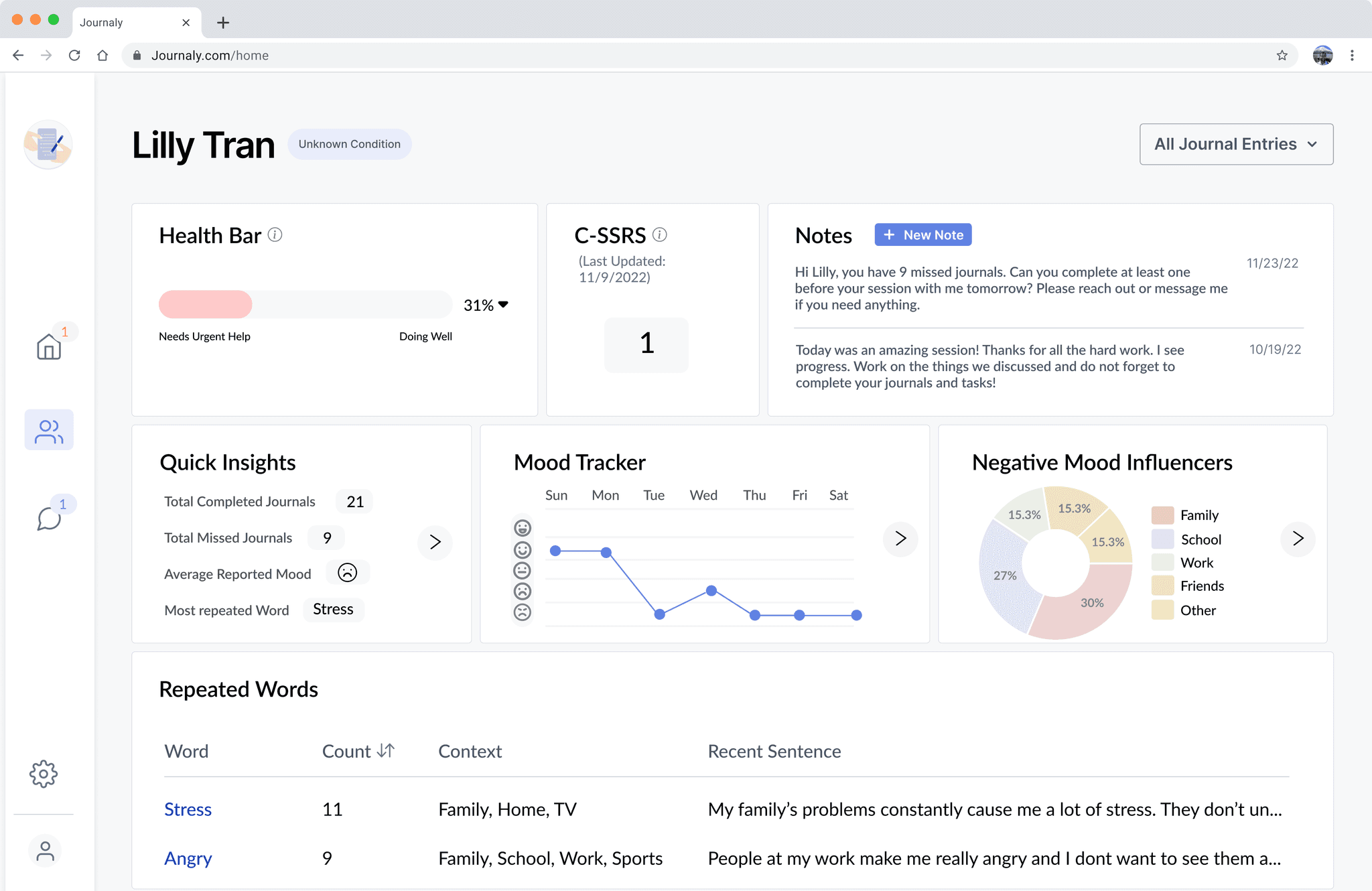 A journaling insights page enables therapists to quickly review and assess each patient's information at a glance.
